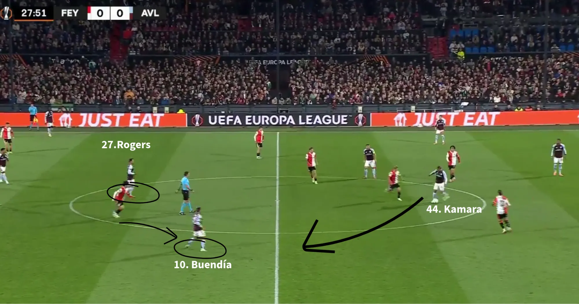 In the Feyenoord game, again we see Buendía break away from his marker in the pocket behind their midfield, this time allowing Rogers even more space. Buendía can receive the ball from Kamara and play it into Rogers, enabling Villa to drive forward.