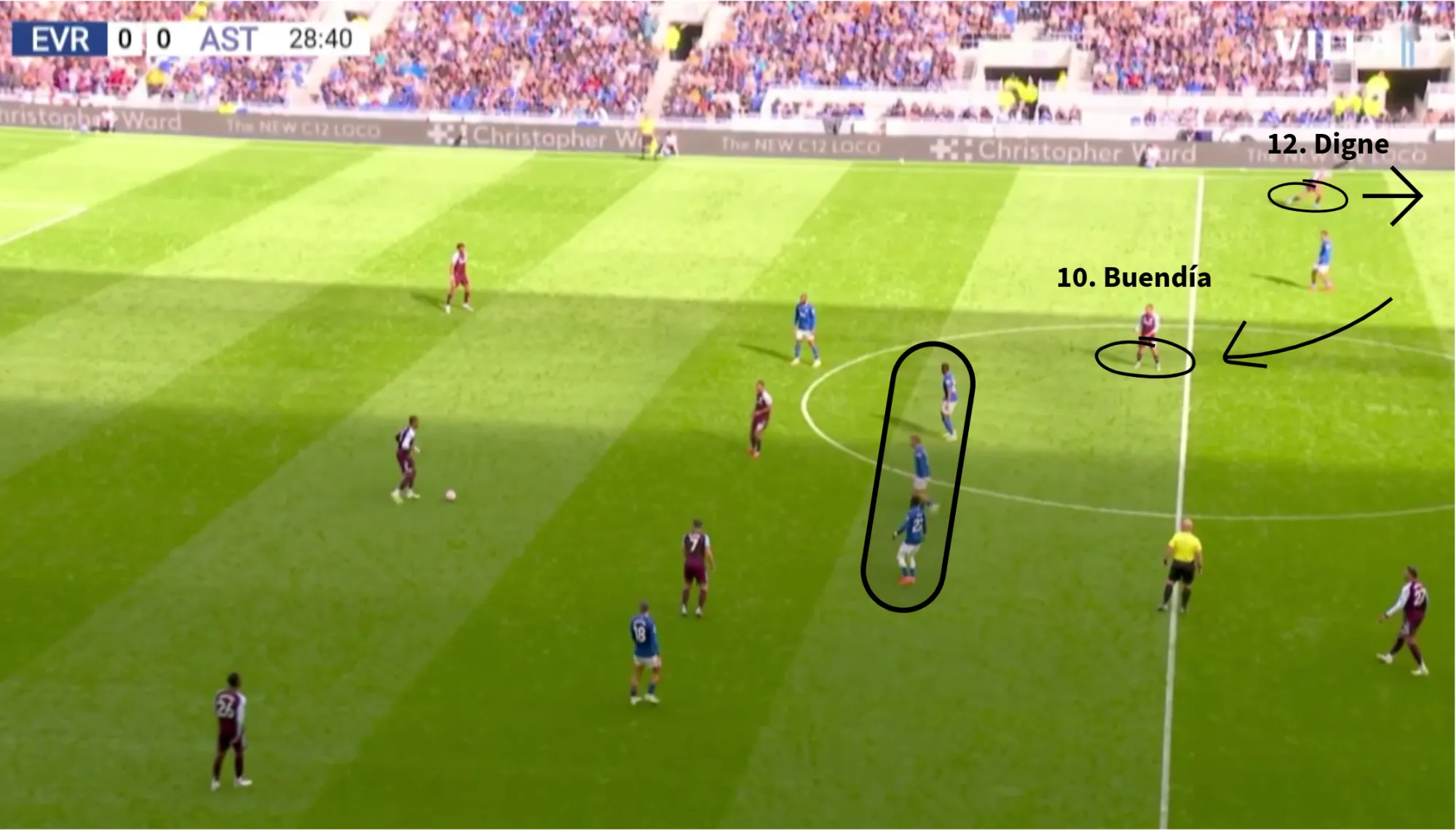 In this image we can see Buendía dropping into the pocket behind Everton's midfield with space to receive the ball and also allowing Digne space to run in behind. This leaves Ndiaye in a dilemma, unsure whether to push onto Buendía, or track Digne making the run.